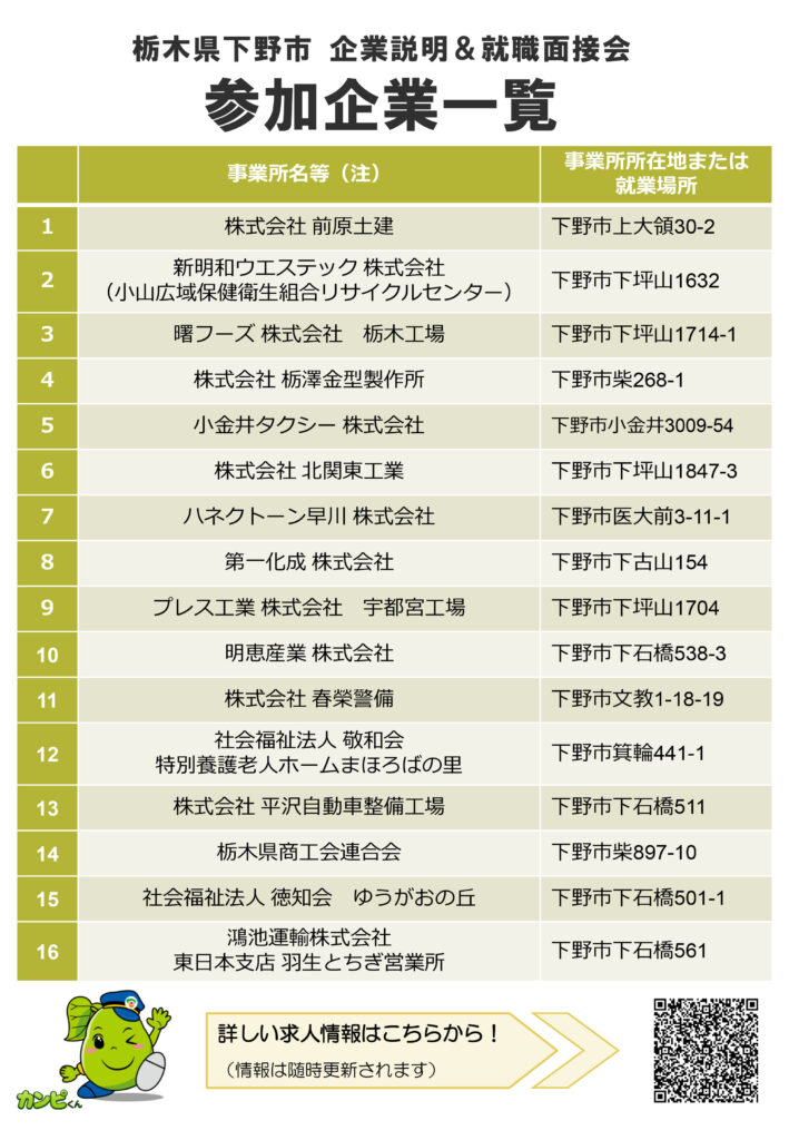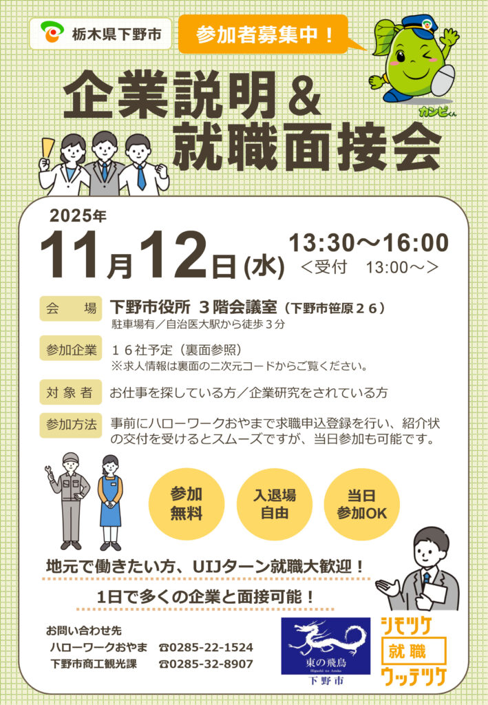 下野市内企業合同での開催となる貴重な機会。事前予約不要。お仕事を探しているすべての方、企業研究をしている方、UIJターン就職も大歓迎です。