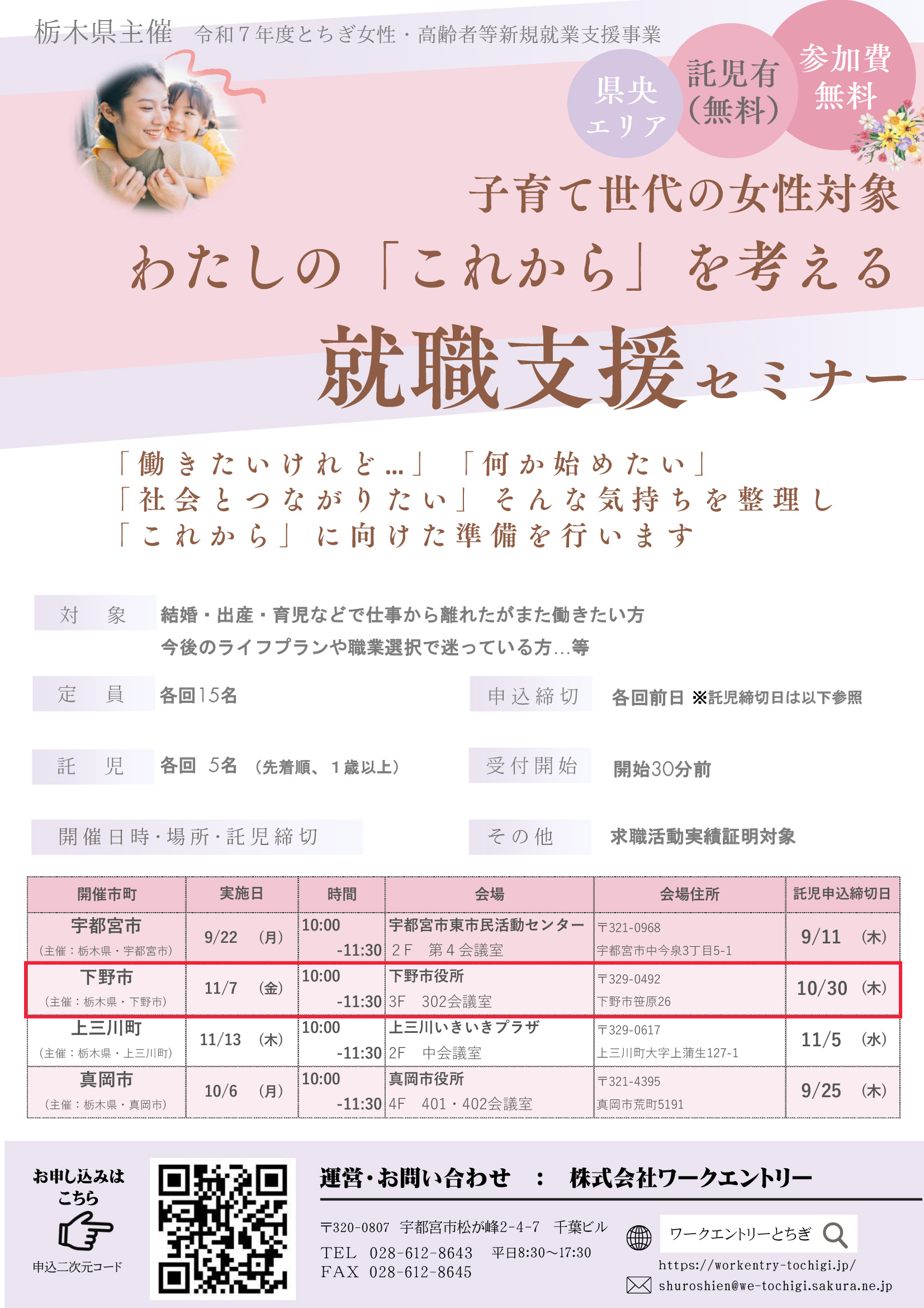結婚・出産・定年などで一度お仕事から離れたが再度働きたい方、ライフプランや職業選択で迷っている方などを対象に就職活動のお手伝いをいたします。お子様連れでの参加も大歓迎!ぜひご参加ください。