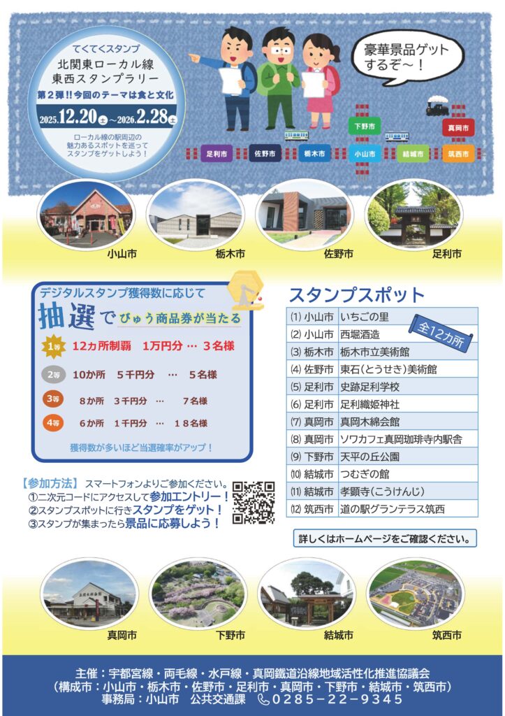 宇都宮線・両毛線・水戸線・真岡鐵道沿線地域を会場に「デジタルスタンプラリー」を開催中!第2弾となる今回のテーマは「食と文化」。下野市では「天平の丘公園」がスタンプスポットになっています。各路線や公共交通機関を使ってイベントエリアの観光スポットや、普段は見過ごしてしまう場所を見つけながら、デジタルスタンプをゲットしよう!