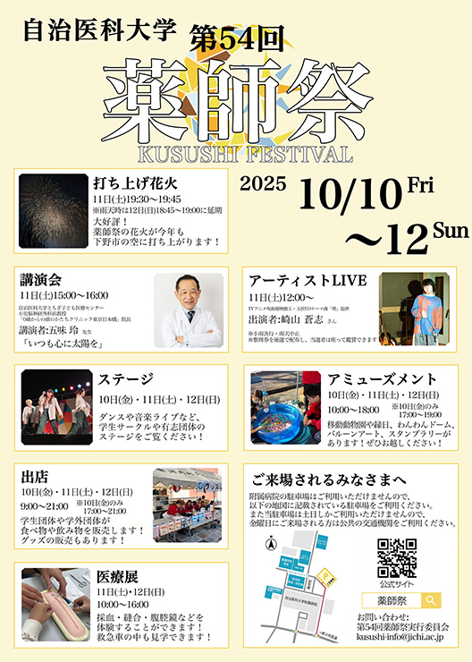 自治医科大学の学園祭「薬師祭(くすしさい)」。毎年豪華なゲストによるLIVEや充実した企画で学生はもちろん、地元地域の人にも親しまれています。