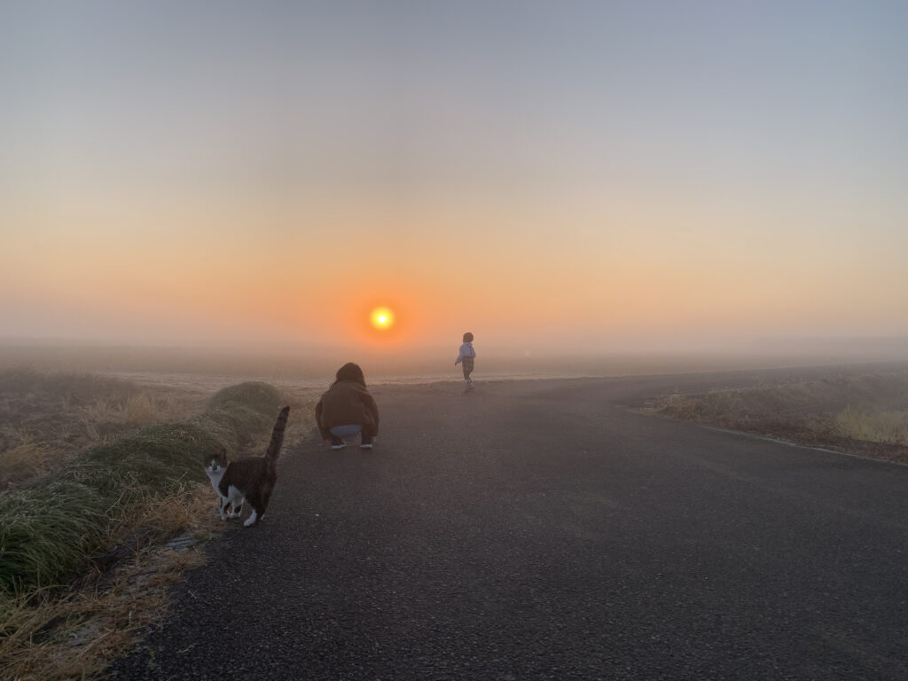 夏の夕暮れを背に、はしゃいでいる子供達。