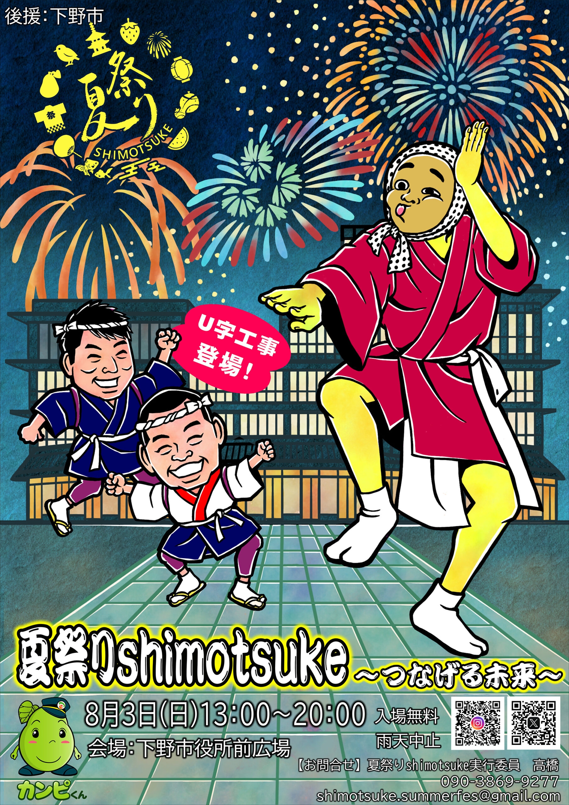 JR自治医大駅(西口)より徒歩3分の下野市役所前広場を会場に、屋台やキッチンカー、特設ステージが登場。第2回は、地元の子どもたちによるパフォーマンスからオーケストラ演奏・・・ステージラストは“U字工事”のお二人による特別ライブが決定。会場近くから上がる打上げ花火も必見です。夏休みの思い出にぜひご来場ください。